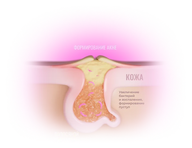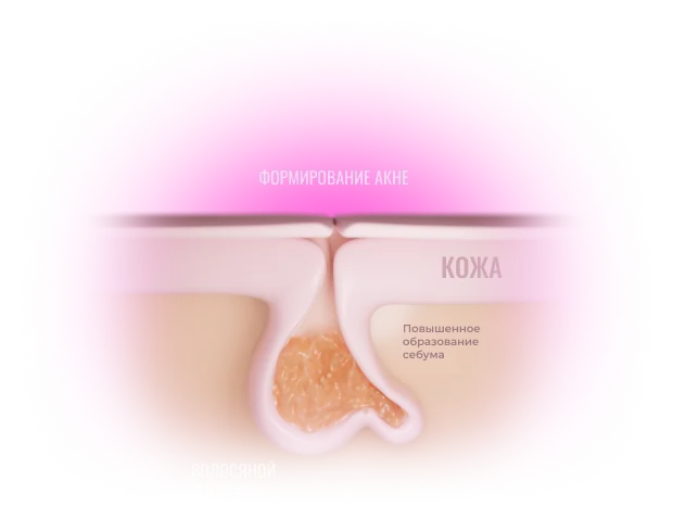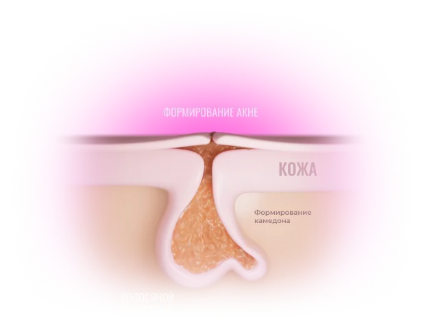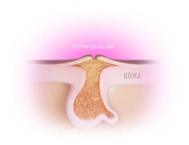 Клетки выводного протока сально-волосяных фолликулов активно делятся, закупоривая выводной проток и формируя «кератиновую пробку», препятствуя нормальному выведению кожного сала на поверхность кожи.